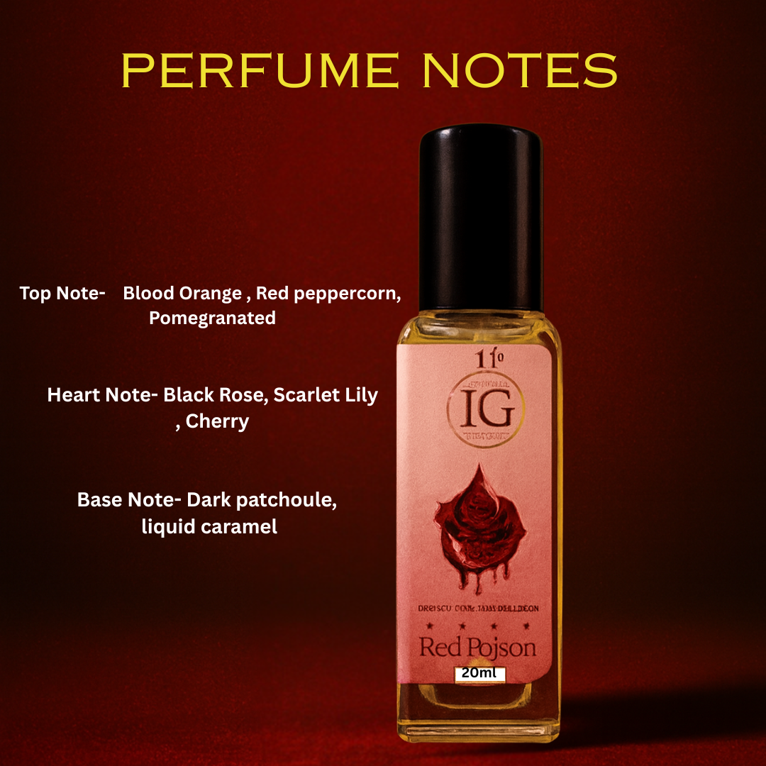 Red Poison is a bold and irresistible fragrance crafted for women who love to leave a mark. Opening with juicy Blood Orange, spicy Red Peppercorn, and exotic Pomegranate, it transitions into the floral heart of Black Rose, Scarlet Lily, and Cherry. The base of Dark Patchouli and Liquid Caramel wraps you in a deep, enchanting aura. A perfect choice for evening wear and special occasions.